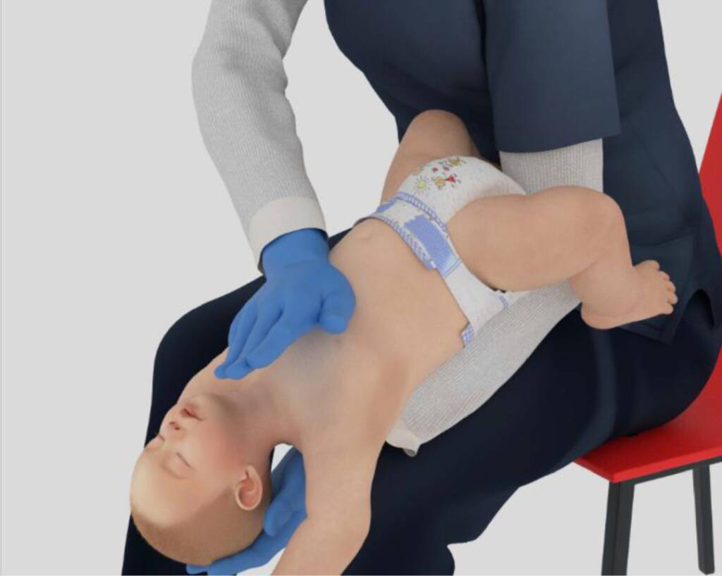 若異物仍未排出,此時(shí)將孩子夾住翻轉(zhuǎn),用掌根按壓胸部5次,重復(fù)以上動(dòng)作。