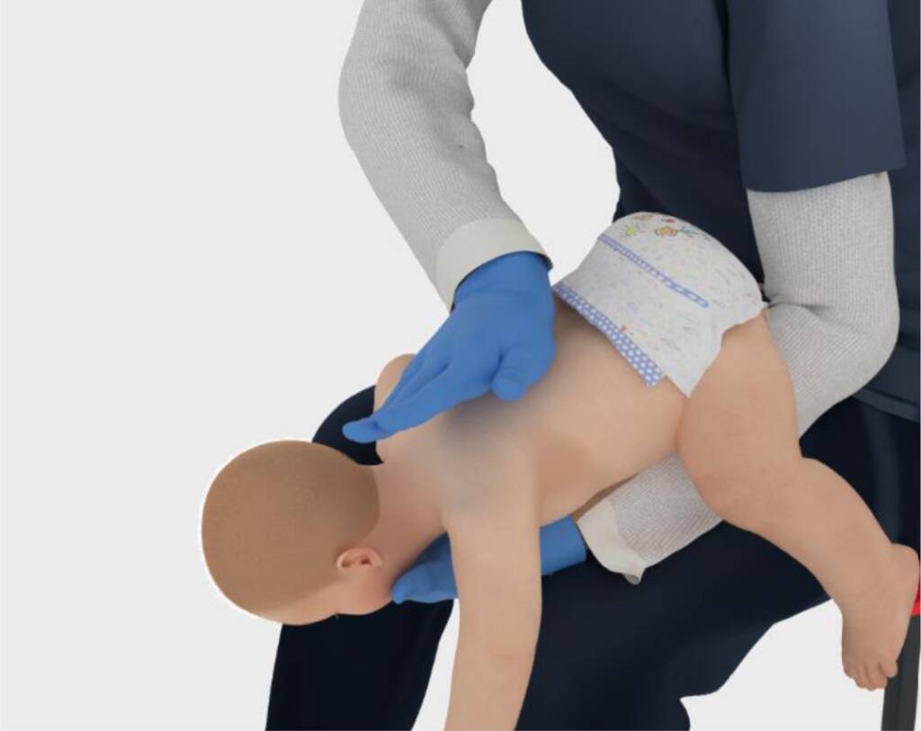 施救方式:背部拍擊同清醒成人,保持前傾姿勢(shì),掌根拍擊肩胛骨連線中點(diǎn)5次。